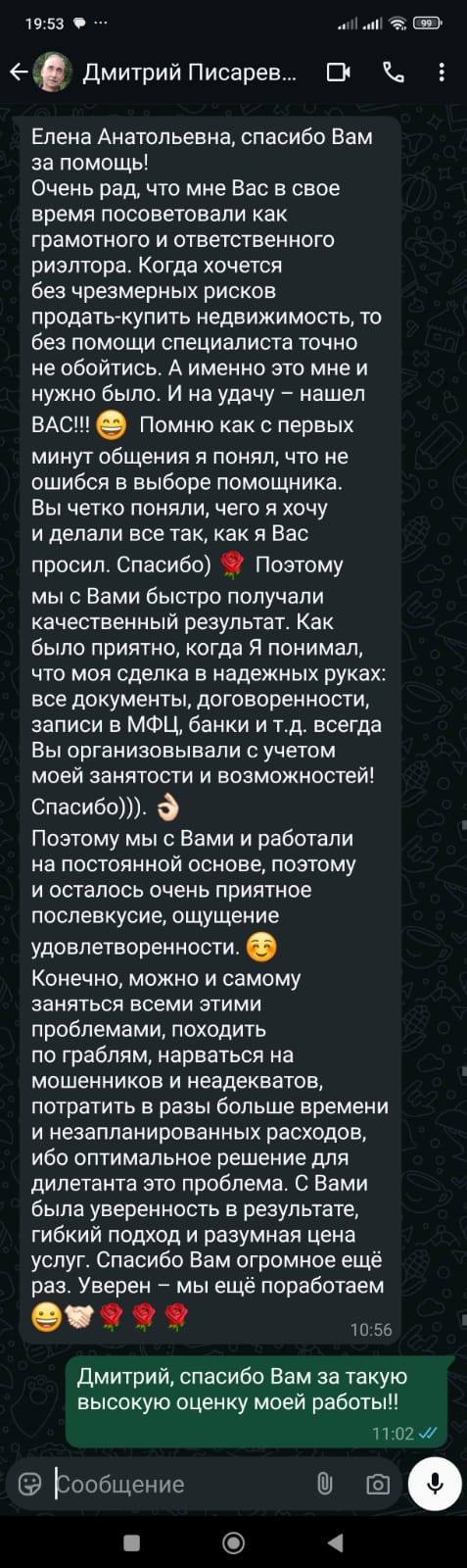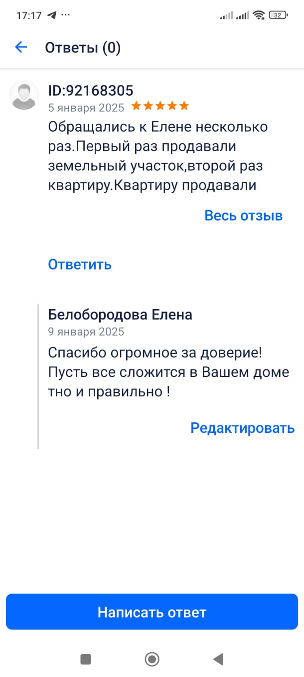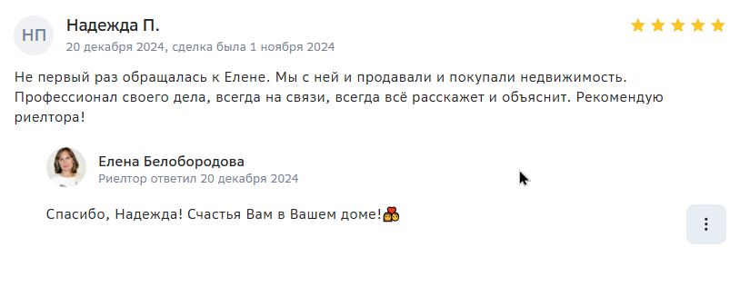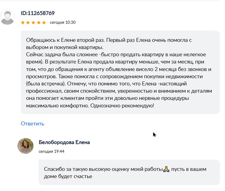 На этой странице опубликованы реальные отзывы клиентов - как положительные, так и отрицательные. Чтобы оставить свой отзыв о работе риэлтора, вам нужно пройти авторизацию,получив короткое смс сообщение. Публикация прикрепленных документов остаётся на усмотрение портала.
