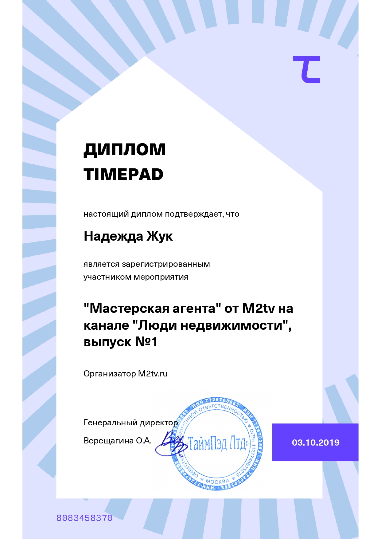 Мне повезло познакомитья с Належдой Владимировноц Жук. Задача была не простая, нужно было продать старую дачу и купить новую с хорошим домом. Надежда Владимировна смогла учесть все мои пожелания. При покупке тебя поджидает много неожиданных сюрпризов, так вот благодаря надежде Владимировне, я не только купила то, что мне нравится, но и избежала возможных ошибок. Она большой профессионал, может предвидетьто, что тебе и вголову не придет. Поясню, мне очень понравился один дом с участком, когда она стала его проверять, то забраковала сделку,меня это расстроило. Но как потом оказалось, она была права, купив этот дом я бы приобрела к нему еще и большие проблемы, т.к. продавцы не всегда все рассказывают покупателям. Но Надежда Владимировна сумела все выяснить. Большое ей спасибо . Очень грамотный, внимательный специалист.