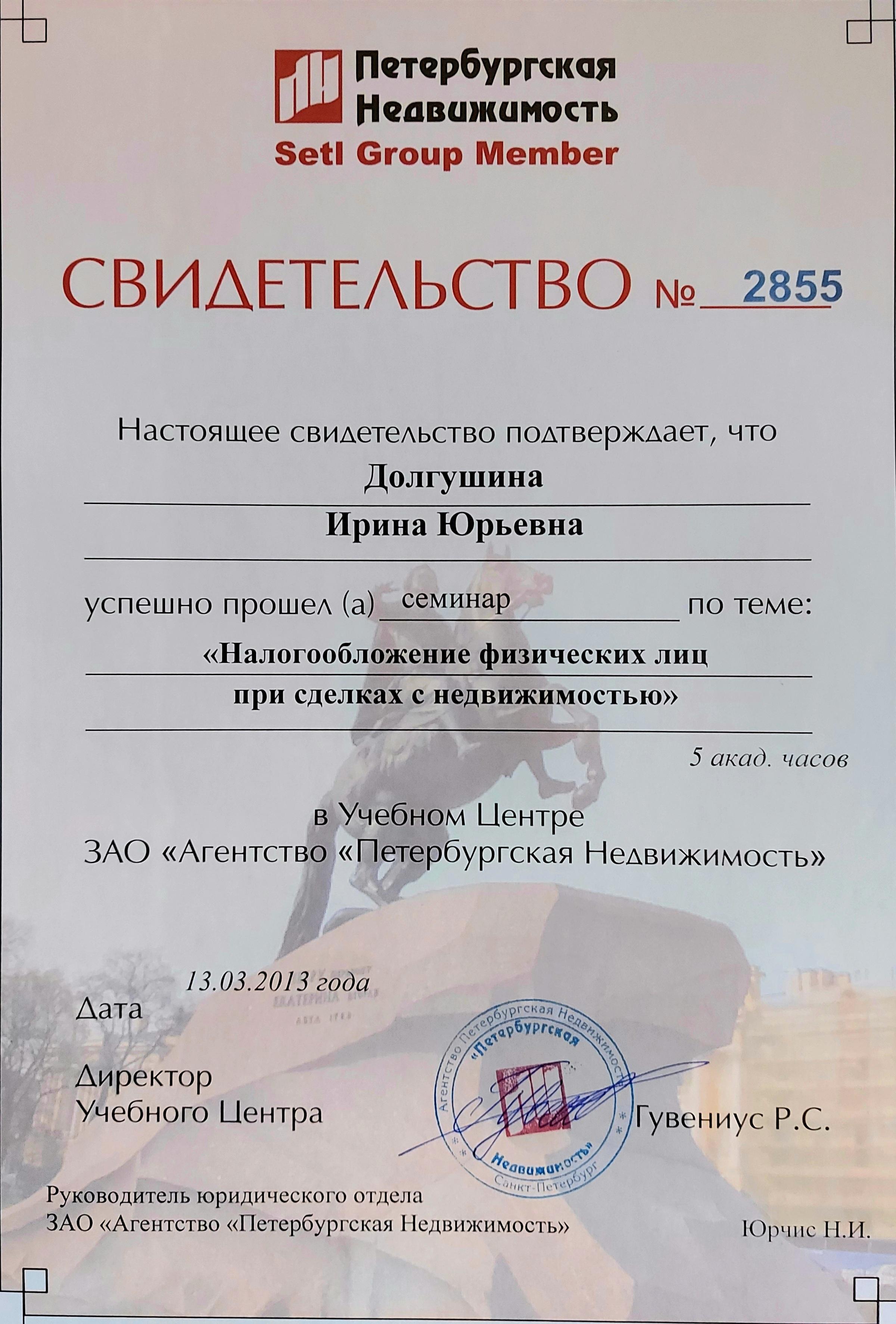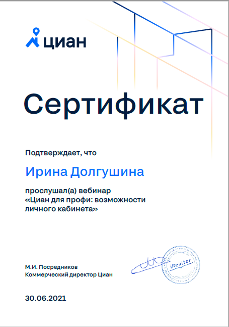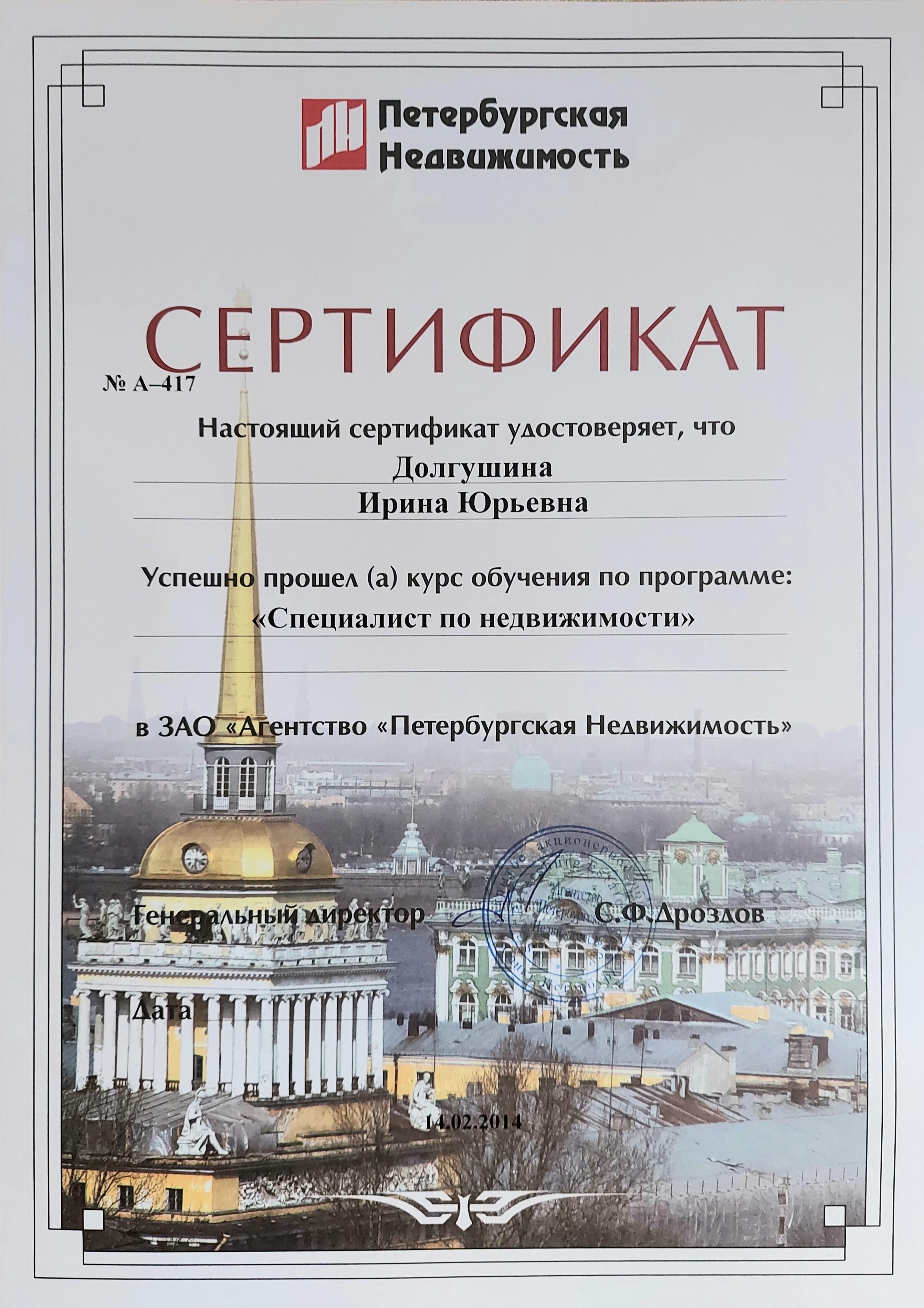 Я однозначно рекомендую Ирину Долгушину как надежного партнера на рынке недвижимости СПб и Лен.области. И выражаю глубочайшее уважение за столько редкую комбинацию высокого профессионализма и прекрасных человечески качеств!