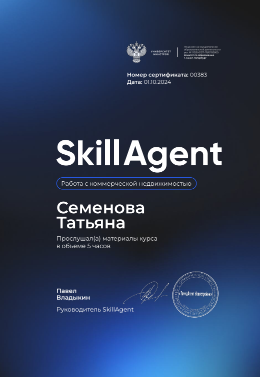Татьяна очень грамотный специалист! Покупали мужем квартиру, нашла много достойных вариантов и помогла выбрать самый идеальный из них!