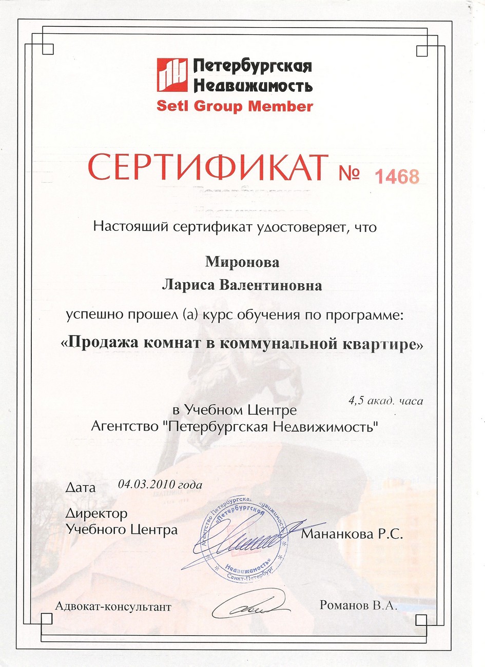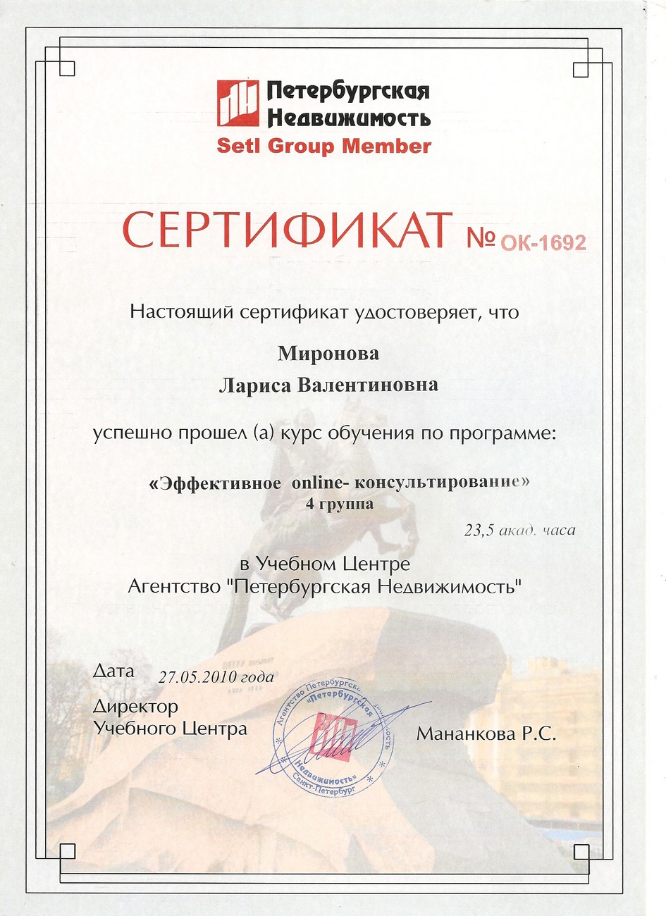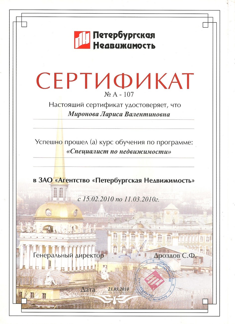 Опыт в недвижимости 20 лет. 15 лет работала специалистом по недвижимости в агентстве "Петербургская Недвижимость" (отдел вторичной недвижимости - продажа\покупка), в агентстве "РусланД" - специализация по коммерческой недвижимости. В течение всего этого времени - консультации, подбор и сопровождение сделок по строящимся объектам Санкт-Петербурга и Ленинградской области. Опыт покупки/продажи недвижимости в Турции. Аттестована и состою в Российской Гильдии Риэлторов. Отзывы клиентов - на странице в VK