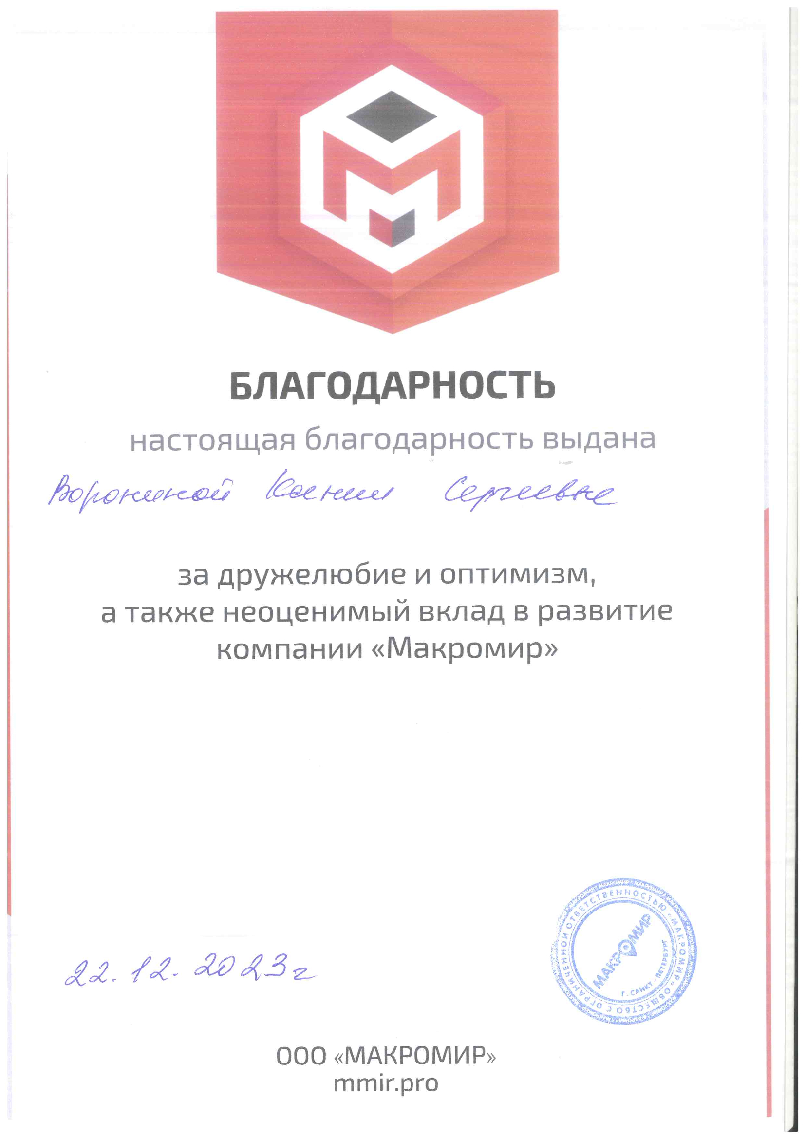 Работа с Ворониной Ксенией была на высшем уровне. Она всегда была на связи и отвечала на все вопросы даже в нерабочее время. Оценка 10 из 10!