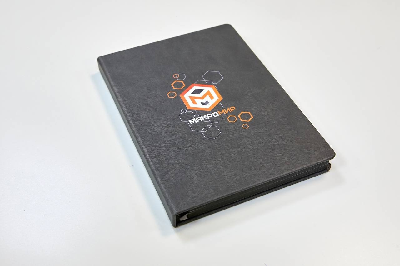 Ежедневник в твердой обложке с логотипом «Макромир». Формат: 10х16 см, цвет: серый, материал: искусственная кожа, вес: 222 г, страниц: 336, недатированный.